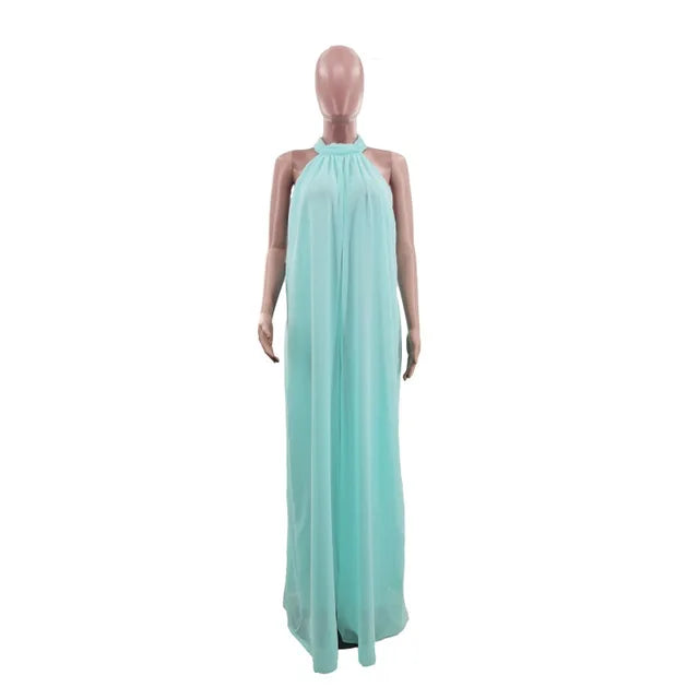 Elegant Holiday Chiffon Jumpsuits Halter Sleeveless High Waist Women Wide Leg Playsuit Open Back Pleated Rompers
