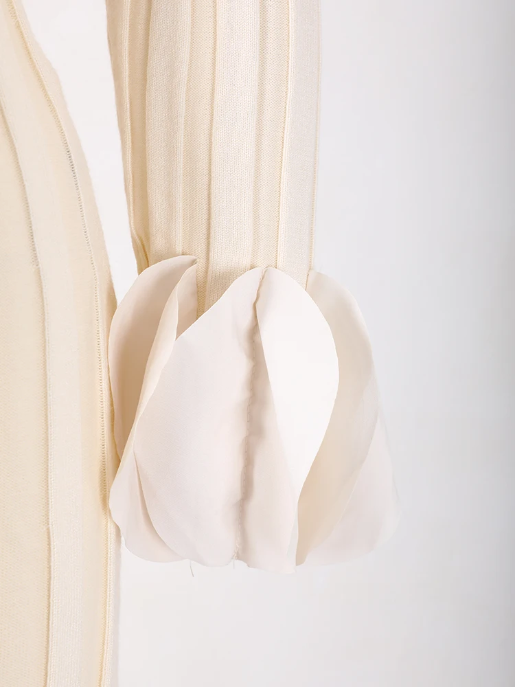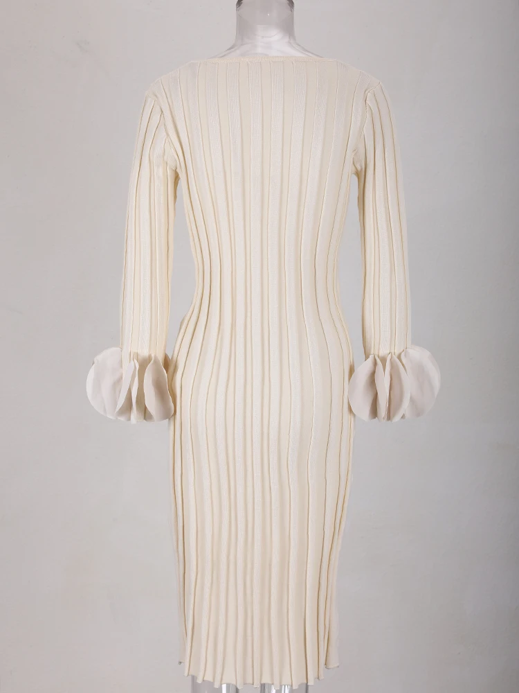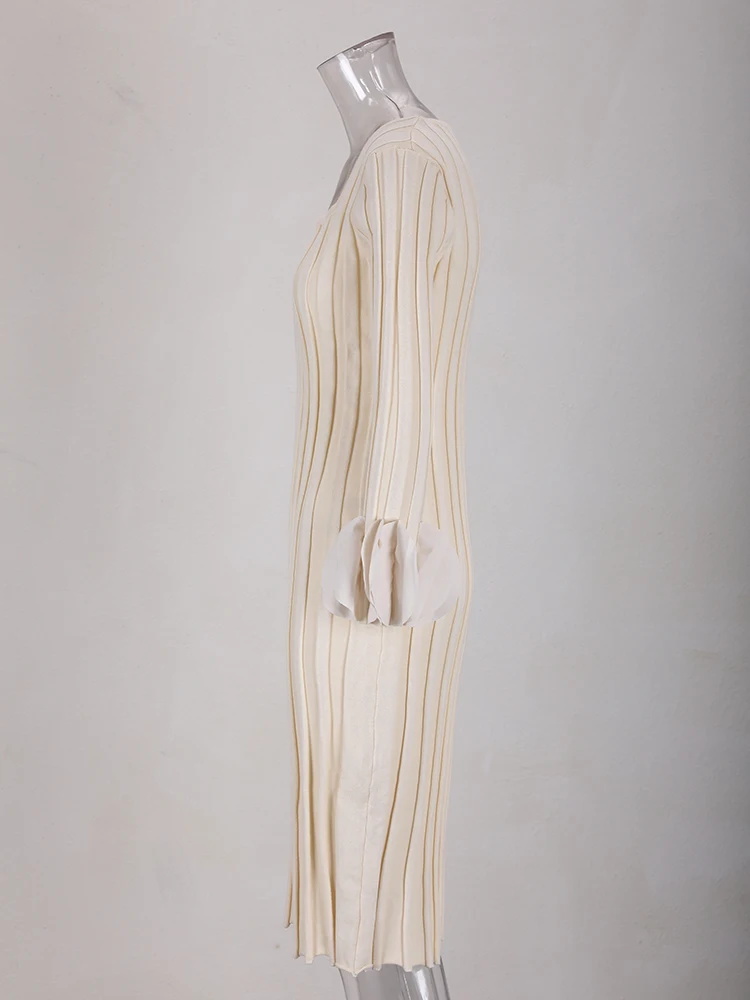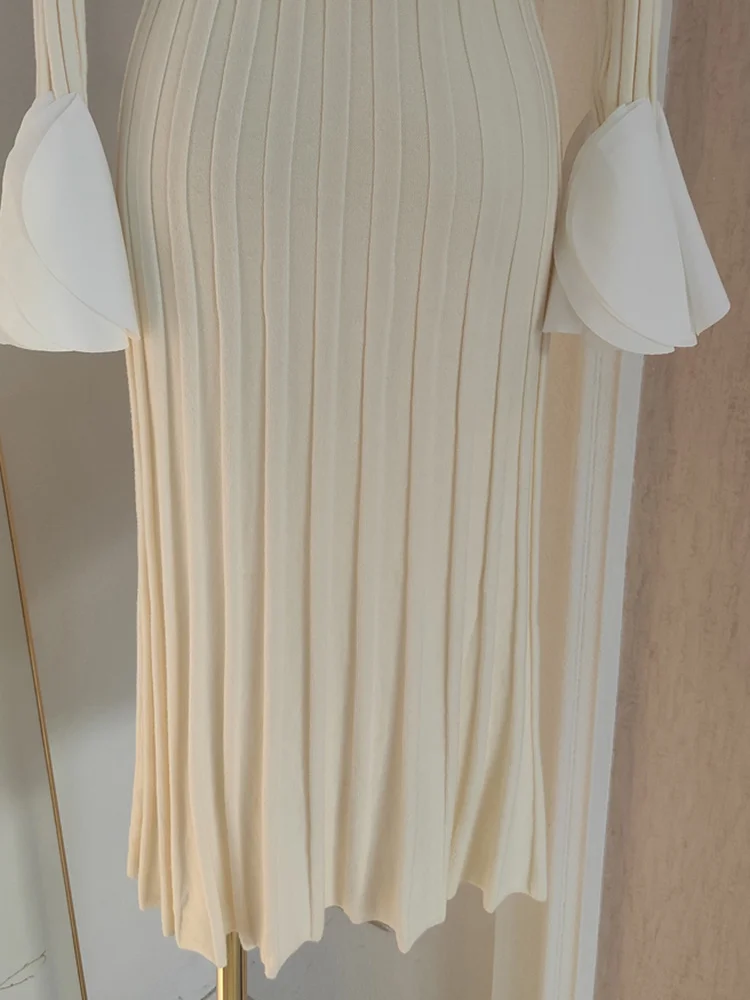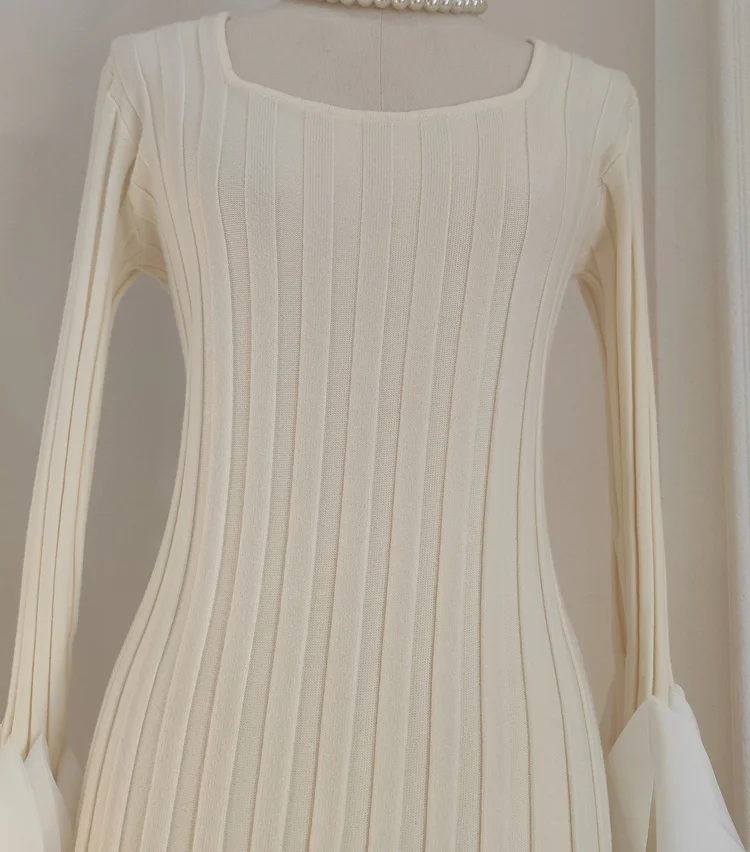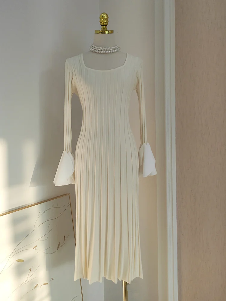 Splicing Knitting Elegant Dresses For Women Square Collar Petal Border Long Sleeve Dress New Spring Clothing